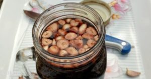First, peel the garlic cloves and cut each into four parts. Place the chopped garlic into a clean, airtight glass container. Pour the half liter of red wine over the garlic, ensuring all the pieces are submerged.
